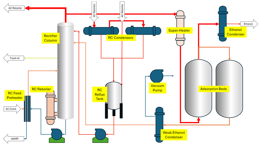 This type of system is characterized by high capital investment. Low steam consumption and low power consumption as compared to distillation. The only disadvantage of molecular sieves is the high attrition rates of sieves in case of small plants. Hence, typically, some amount of sieve material needs replacement periodically, thereby resulting in higher cost of production in case of small capacity plants. In case of large capacity plants, the molecular sieve is the most optimum both in terms of initial investment and operating cost. The total unit is operated with DCS computer controls system. This will help in maintaining the parameters consistent and without any fluctuations. This is the common method used in modern distillery plants for controlling their parameters.