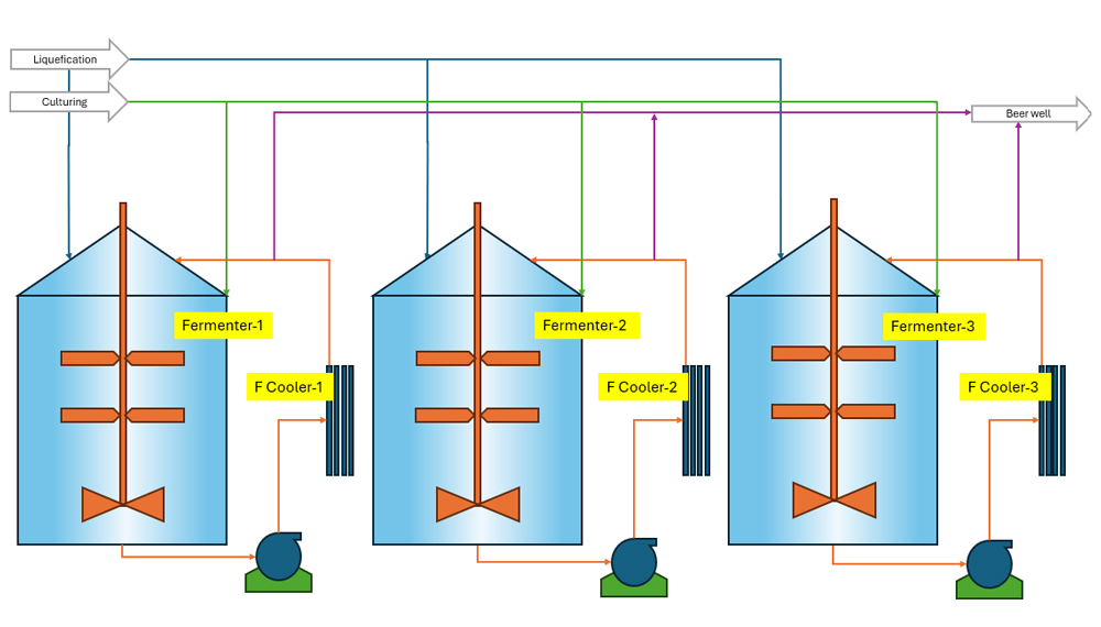 Grain based fermentation also consisting of four fermenter system. Saccharified slurry from Liquifaction section is pumped into Fermenter and is diluted to appropriate sugar concentration by adding water. Yeast is propagated in Pre Fermenters using Saccharified slurry as media. After desired gravity is achieved in Pre Fermenter, the yeast slurry is transferred to Fermenters. The assailable nitrogen are added in the medium in the form of Urea and DAP. Temperature in the Fermenter is maintained with the help of plate heat exchanger (PHE). The fermented mash is recirculated continuously through PHE which helps in proper mixing of fermented mash. The rate of fermentation reaction gradually increases and after 50 to 55 hours, fermentation completes. After completion of reaction the fermented mash is delivered to Wash holding tank. The fermented mash collected in the Wash holding tank is then pumped to Analyzer or Primary column for distillation.