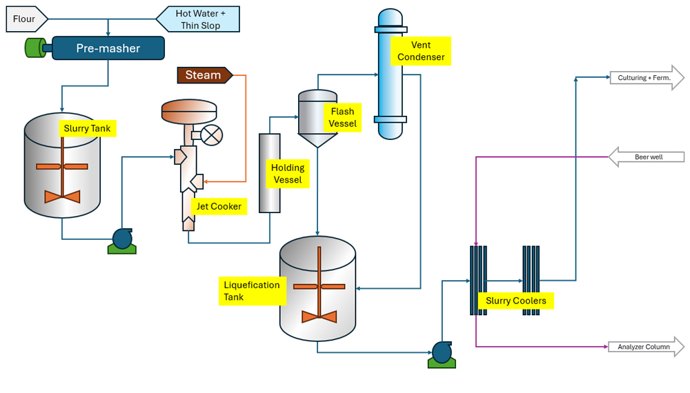Slurry from Pre Masher enters Slurry mix tank, where it is thoroughly mixed with process condensate/hot water with the help of a low speed agitator. The grain meal is wetted and mixed to expose the starch and allow it to be chemically broken or converted, into Sugar molecules like dextrins. The gentle mixing of flour with hot water is carried out to eliminate any lump formation. Part of Liquifaction enzyme is added to begin the initial conversion of the starch to low viscosity dextrins. Enzymes are designed to have maximum effectiveness at a set temperature and pH. Depending on the process requirement part of Thin slop (backset) from Decantation section is recycled to the Mixing tank. First it provides a source of nutrients for yeast production. Secondly, it optimizes the recovery of ethanol and process waters, there by improving the overall plant economics. The properly mixed slurry is then pumped to Jet cooker using slurry transfer pumps.