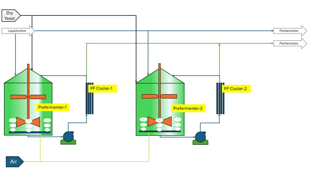 Yeast culture is developed in Laboratory and propagated in Propagation vessels and Pre Fermenters using Molasses as media. Accessories like Plate Heat Exchangers for cooling, Air spargers, Broth mixers etc. are provided in Pre Fermenters. Once the desired gravity is achieved in Pre Fermenters, the yeast culture from Pre Fermenter is transferred to Fermenters.